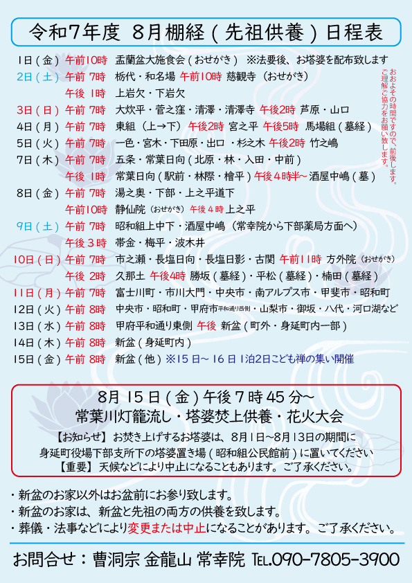 第14回常葉川灯籠流し&塔婆焚上供養&花火大会(8月15日)